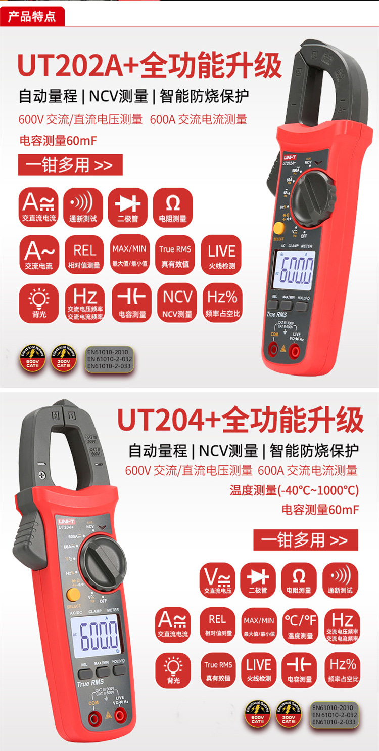优利德(UNI-T)UT204+ 数字交直流钳型万用表 钳形表 钳表 电流表